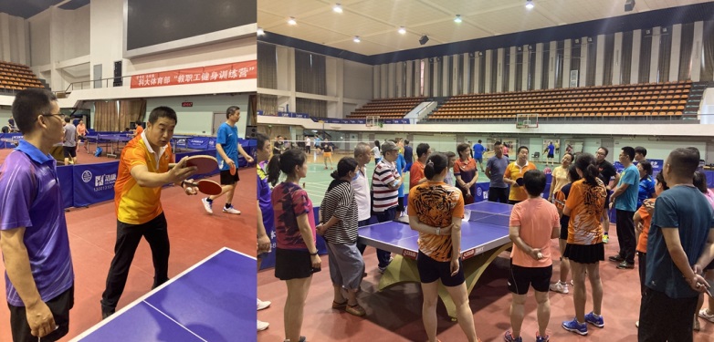 近日,体育部第二期教职工健身训练营活动分别在两校区体育馆举办,本期训练营共开设“乒乓球”、“羽毛球”、“健身操舞”三门课程,全校约70余名老师参加本期活动。
