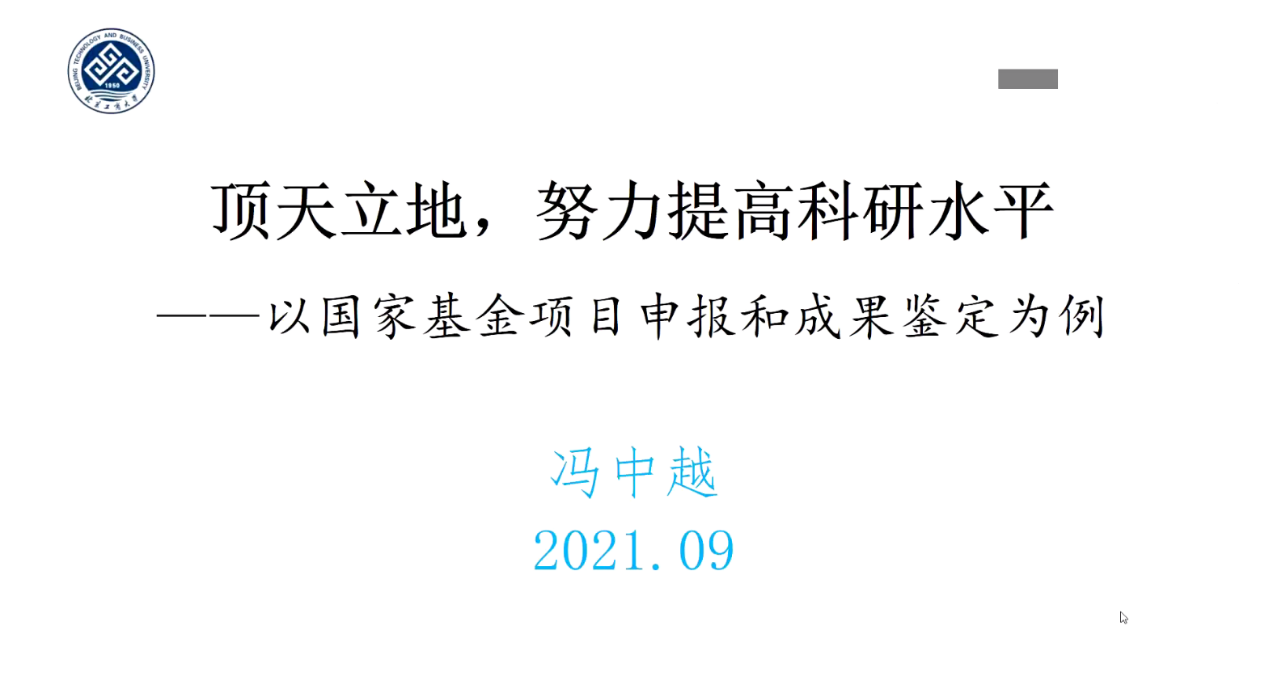 9月28日19点,教师发展中心尚行学术工作坊开讲,首期工作坊由社会科学处和教师发展中心联合举办,邀请北京工商大学经济学院冯中越教授为我校教师做《顶天立地 努力提高科研水平——以国家基金项目申报和成果鉴定为例》的专题线上培训讲座,来自我校各教学单位的100余名教师参加培训。培训讲座由社会科学处处长毛文娟教授主持。