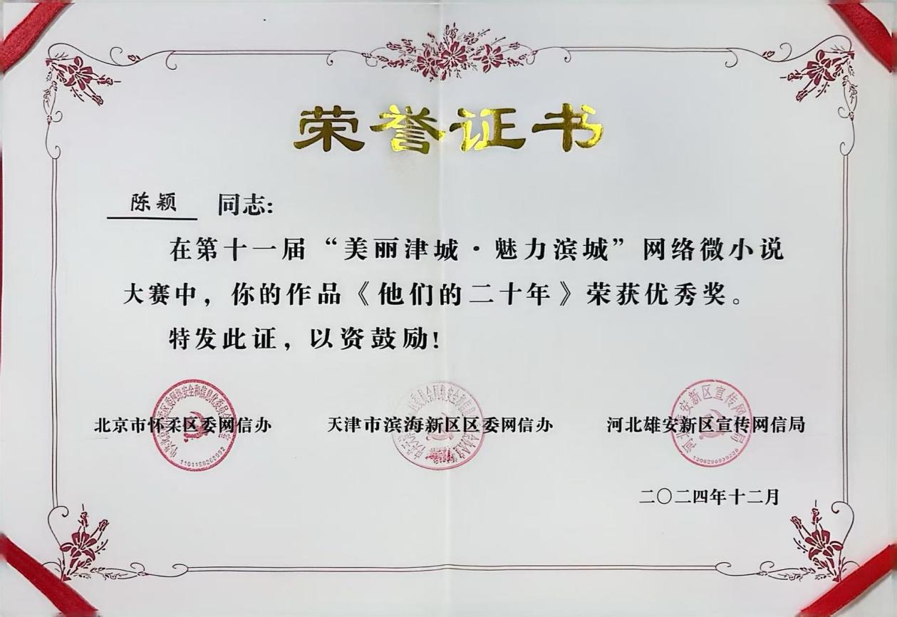 近日,由天津市委网信办主办、滨海新区区委网信办承办的“美丽津城·魅力滨城”网络微小说大赛评选结果正式揭晓。我校网信办教师陈颖创作的微小说《他们的二十年》从众多参赛作品中脱颖而出,荣获优秀奖。