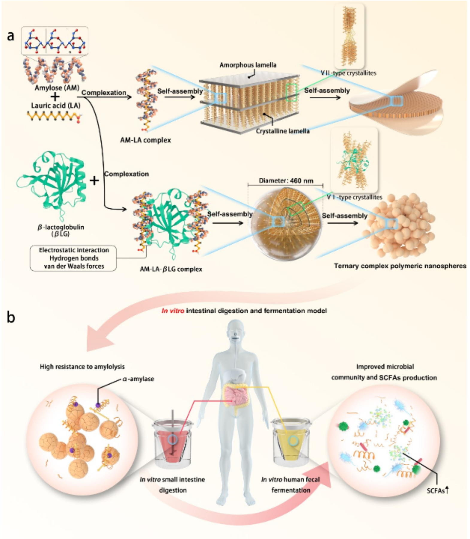 图2. AM-LA-βLG复合物形成与自组装(a)及其纳米颗粒的体外小肠消化与结肠发酵特性(b)