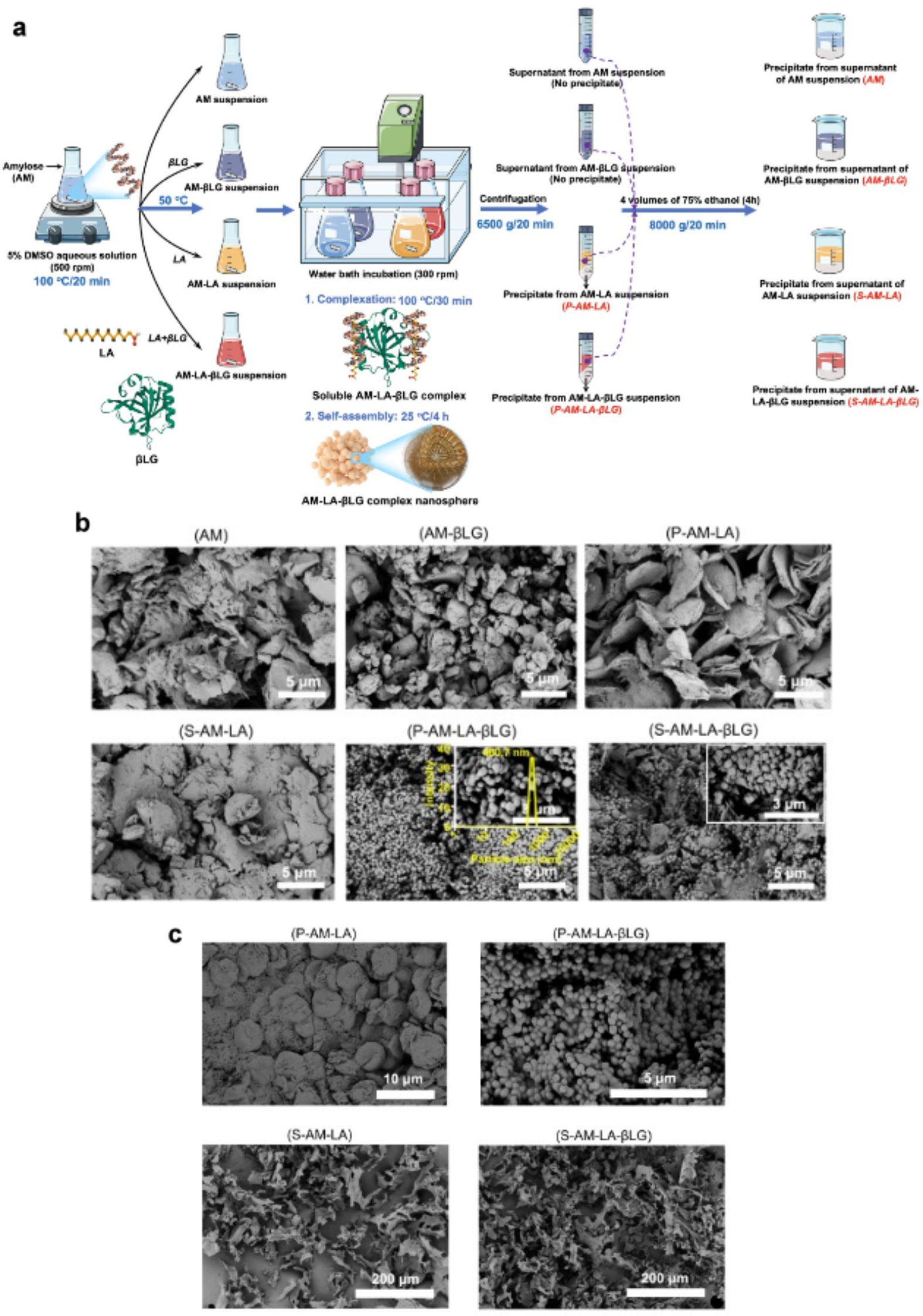 为深入了解多元生物大分子间如何相互作用形成复合物及其是否/如何进一步组装成为有序的聚集体结构,课题组以直链淀粉(AM)、月桂酸(LA)和β-乳球蛋白(βLG)为研究对象,报道了一种基于DMSO/水体系热诱导AM-LA-βLG复合物形成及自组装纳米微球聚集体模型(图1a)。研究发现,相比于AM和AM-LA二元体系,AM-LA-βLG三元体系沉淀及上清液(乙醇醇沉)组分均由尺寸均一、直径为460 nm左右的纳米微球构成(图1b),而直接冷冻干燥的AM-LA-βLG上清液则不存在纳米微球(图1c)。随后通过凝胶渗透色谱等证实了AM-LA-βLG水溶性三元复合物的形成,其在较高浓度或醇沉条件下能够有序排列并自组装为三元复合物纳米微球。三元复合物纳米微球的热稳定性及结构有序性相比于AM-LA复合物聚集体较弱。AM与LA之间的疏水相互作用和范德华力,以及AM与βLG之间的范德华力和氢键是三元复合物形成的主要驱动力(图2a)。