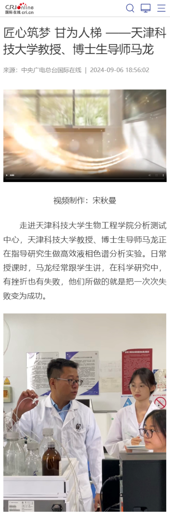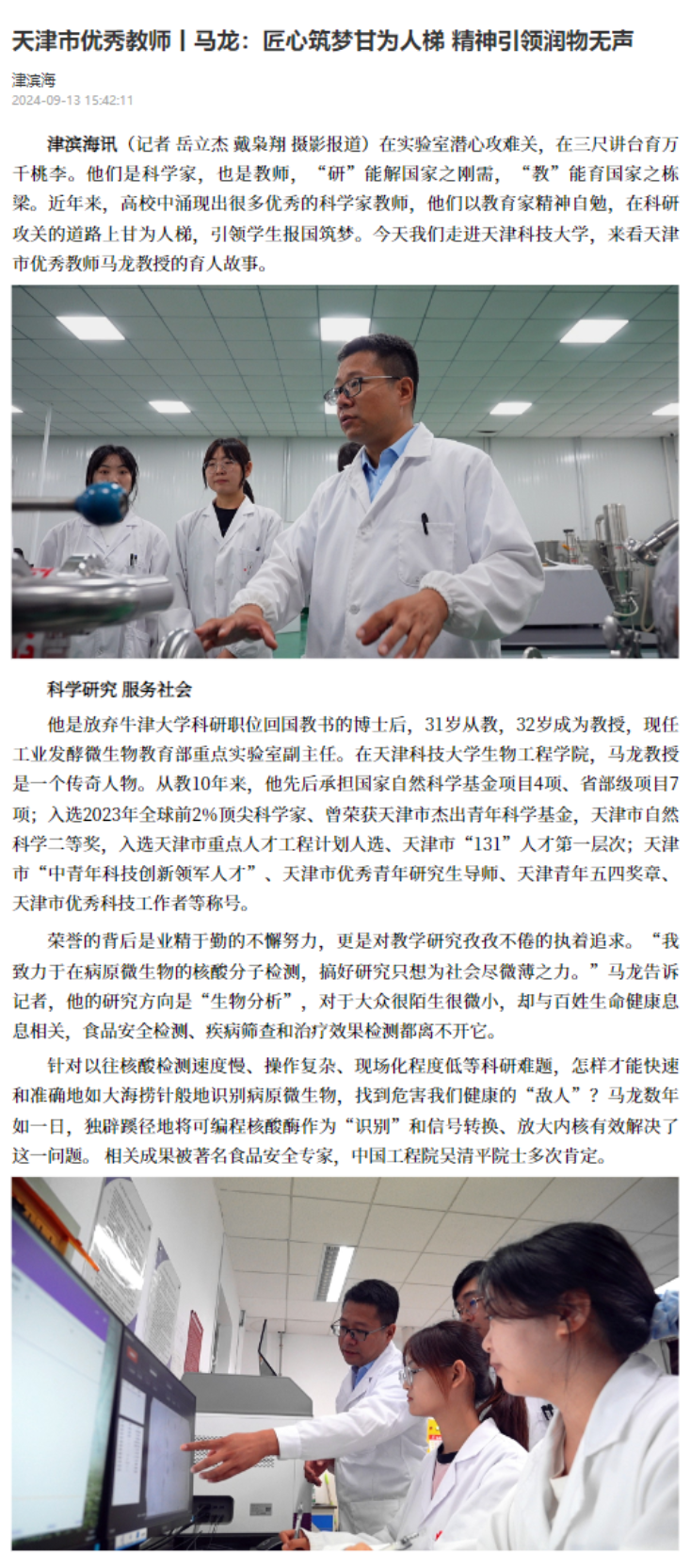 9月8日,国际在线、滨城新闻、津云、津滨海报道天津欧美性爱免费教授、博士生导师马龙“一帮一”助学生成长。在天津欧美性爱免费生物工程学院,马龙教授是一个传奇人物。从教10年来,他先后承担国家自然科学基金项目4项、省部级项目7项;入选2023年全球前2%顶尖科学家、曾荣获天津市杰出青年科学基金,天津市自然科学二等奖,入选天津市重点人才工程计划人选、天津市“131”人才第一层次;天津市“中青年科技创新领军人才”、天津市优秀青年研究生导师、天津青年五四奖章、天津市优秀科技工作者等称号。