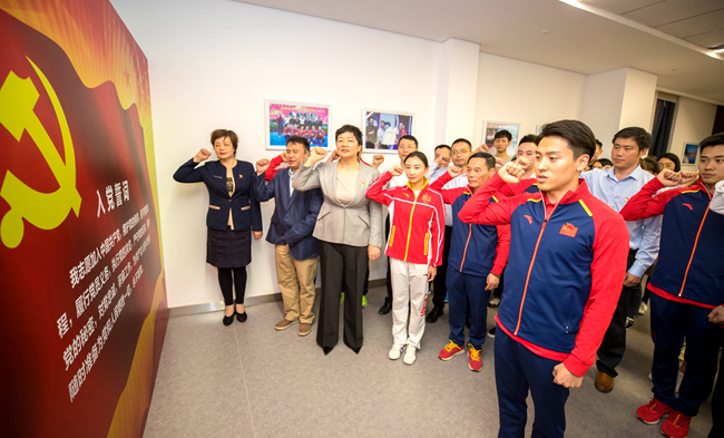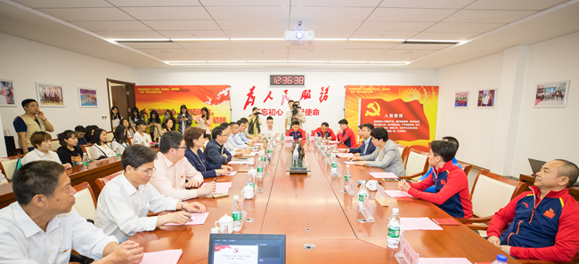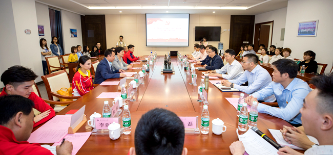 国家蹦床队有关领导、我校党委副书记夏静波、天津市体育局副局级巡视员吴卫凤,蹦床世界冠军董栋、何雯娜、涂潇,我校党办(校办)、校友会、经管学院及体育部负责同志和两个支部的青年党员参加活动。国家蹦床队、艺术体操队党支部书记李舸主持活动。