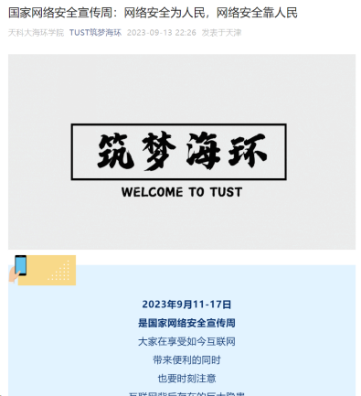 人工智能学院举办了“新生网络护航”知识竞赛,让新生们在更加实际、有趣的环境中学习网络安全和反欺诈知识,提高实际应对能力,引起更多人对网络安全和反欺诈问题的重视,为建立起一个更加安全的校园网络环境贡献一份力量。各学院组织学生积极参与#TUST网络安全宣传周#微博接力活动。