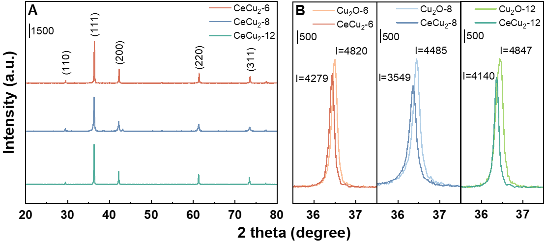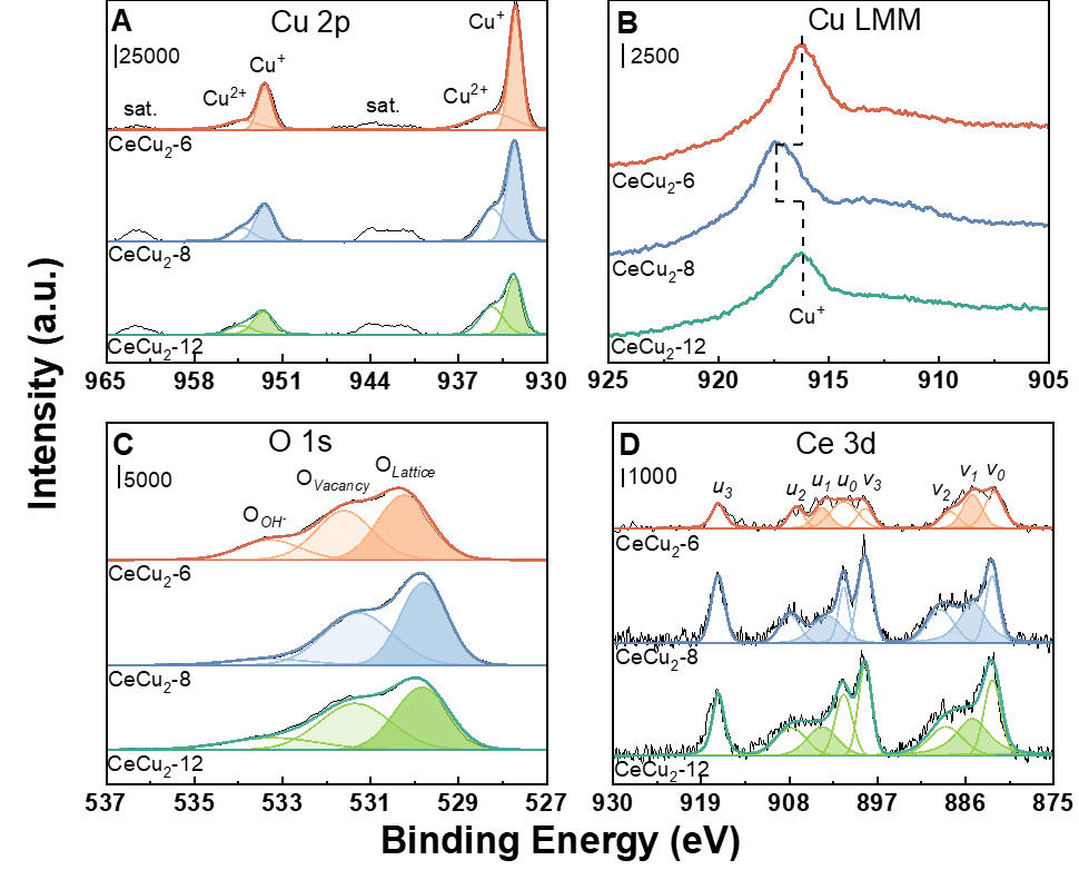 图1.XRD:(A)CeCu2催化(B)(1 1 1)峰的比较。SEM:(A1)Cu2O-6、(A2)CeCu2-6、(B1)Cu2O-8、(B2)CeCu2-8、(C1)Cu2O-12和(C2)CeCu2-12EDS:(D1)CeCu2-6、(D2)CeCu2-8和(D3)CeCu2-12 XPS:(A)Cu 2p,(C)O 1s,(D)Ce 3d和Cu-LMM(B)的AES光谱 H2-TPR:(A)纯Cu2O和(B)反CeCu2。(C)催化剂的O2-TPD曲线。