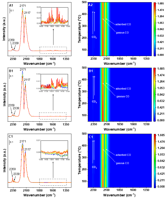 动力学实验表明反应遵循Mars-van Krevelen机理。并且在经过反相负载后,催化剂活性得到显著提升,表面活化能降低,遵循八面体>十二面体>六面体的规律。从六面体(100),八面体(111)与十二面体(110)的晶面结构图可见(100)最外层为氧原子,铜原子在次外层,这种结构不利于铜与铈的接触,削弱了协同效应;(110)最外层有铜原子,可与铈直接接触产生协同效应;虽然(111)上铜原子在次外层,但开放的表面允许铜原子与铈原子的接触,同时(111)晶面独有的更高活性的配位不饱和的Cu+促进了协同效应。原位红外实验结果说明三种催化剂上都出现Cu+-羰基、气相CO、气相CO2的吸收峰。原位红外结果与动力学实验一致,表明反应遵循M-K机理。