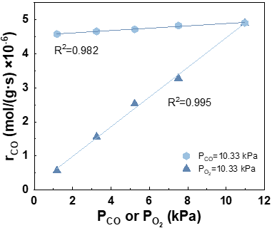 图3描述了CeO2/Cu2O催化剂上的CO自持催化燃烧反应的M-K机理。铜-铈协同效应可在催化剂表面产生大量氧空位。氧空位吸附并活化O2形成具有活性的晶格氧。CO吸附到Cu+上形成Cu+-CO中间产物,与相邻氧空位上的一个晶格氧反应,产生CO2并脱附。之后再次吸附的CO与剩下一个晶格氧反应生成CO2并脱附,氧空位再次产生,形成循环。