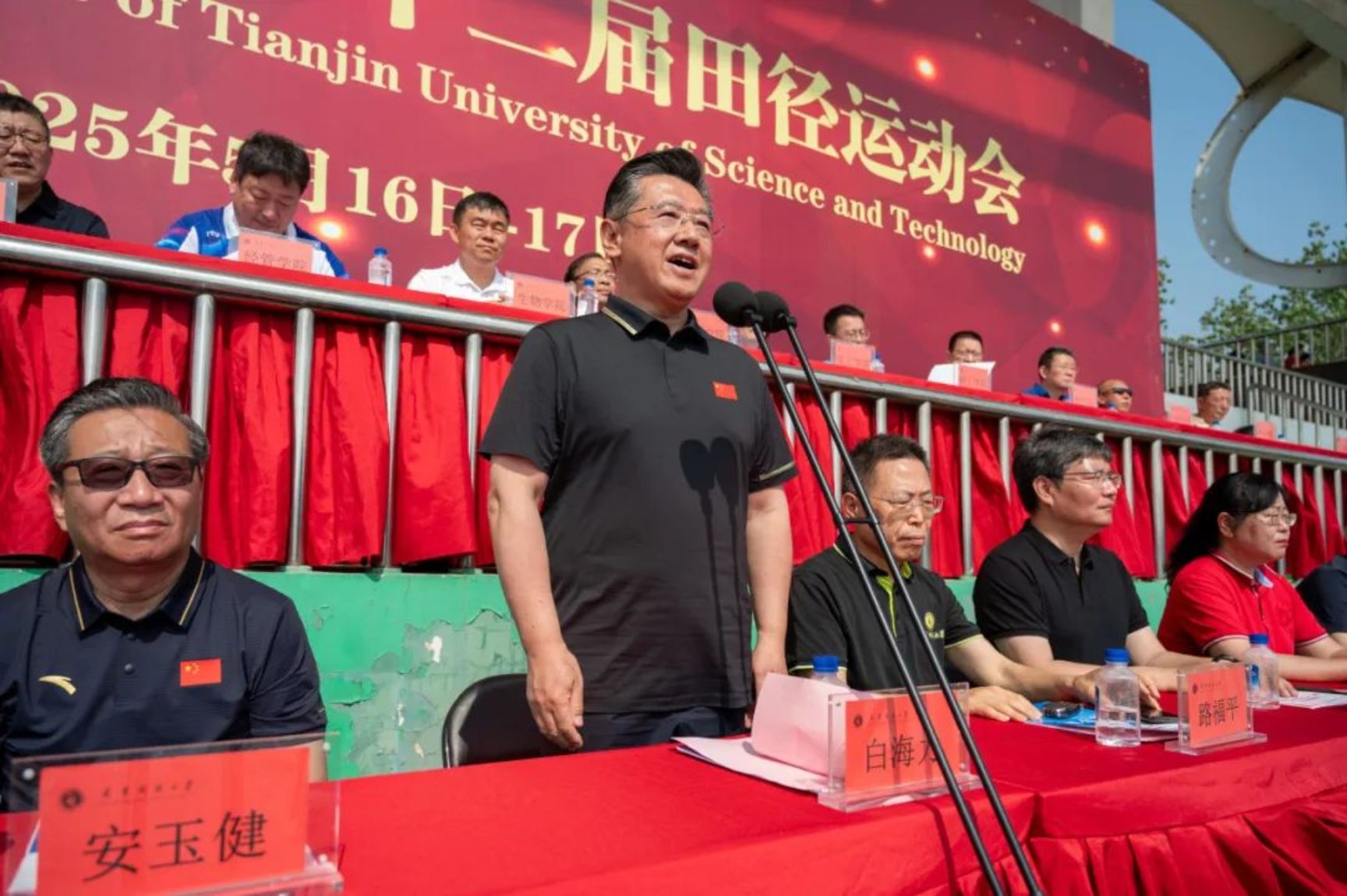 校党委副书记安玉健致辞,他表示,学校党委始终坚持把抓好体育工作作为高质量发展的重要内容,精心谋划、狠抓落实。学校体育教育教学改革不断深化,课程思政建设持续加强,校园阳光体育特色活动日渐多样,“以体育人、以体育智、以体育心”的途径更加丰富完善,越来越多的师生关心体育、热爱体育、参与体育,校园体育运动氛围日渐浓厚、运动热情持续高涨。运动会是学校参与度最广泛、历史最悠久的体育盛会,是青年的盛会、友谊的盛会。他鼓励全体科大师生展现新时代科大人自信拼搏、勇争先锋的精神风貌,传达新时代科大人推行 “先锋计划” 的坚定信心与决心。