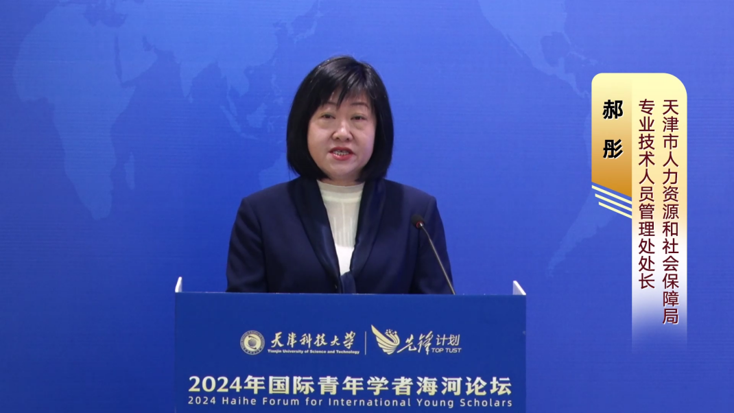 郝彤代表市人社局对论坛的举办表示热烈地祝贺,对参加论坛的海内外青年学者表示诚挚的欢迎。她介绍了天津当前的战略机遇及人才发展环境,着重介绍了博士后引育、留学归国人员创业、创新型人才培养、人才服务体系等方面的政策,最后诚邀各路青年英才来天津发展,大显身手、大展宏图、圆梦天津。