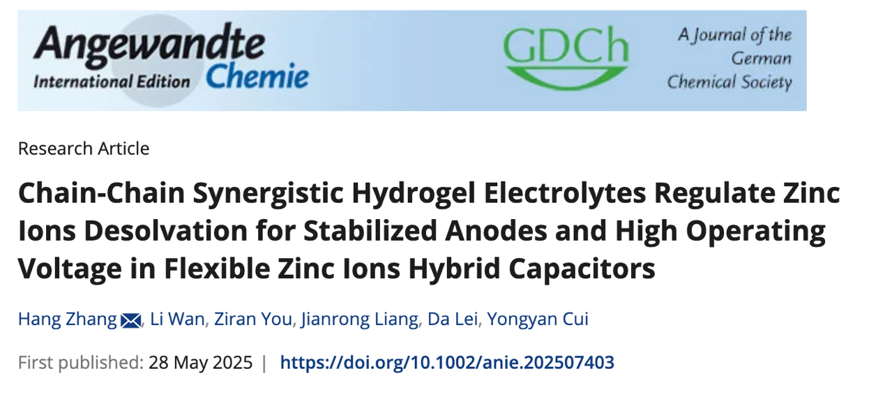 近日,我校化工与材料学院高分子材料改性及成型加工团队在基于链-链协同水凝胶电解质调控锌离子去溶剂化过程方面取得重要进展,相关研究成果以“Chain-Chain Synergistic Hydrogel Electrolytes Regulate Zinc Ions Desolvation for Stabilized Anodes and High Operating Voltage in Flexible Zinc Ions Hybrid Capacitors”为题,发表在化学化工领域国际顶级期刊《Angewandte Chemie International Edition》。天津欧美性爱免费为文章第一作者和通讯作者单位,化工与材料学院青年教师张杭、2024届硕士研究生万里为该论文共同第一作者,天津欧美性爱免费张杭博士、崔永岩副教授和中国科学院青海盐湖研究所雷达副研究员为共同通讯作者。