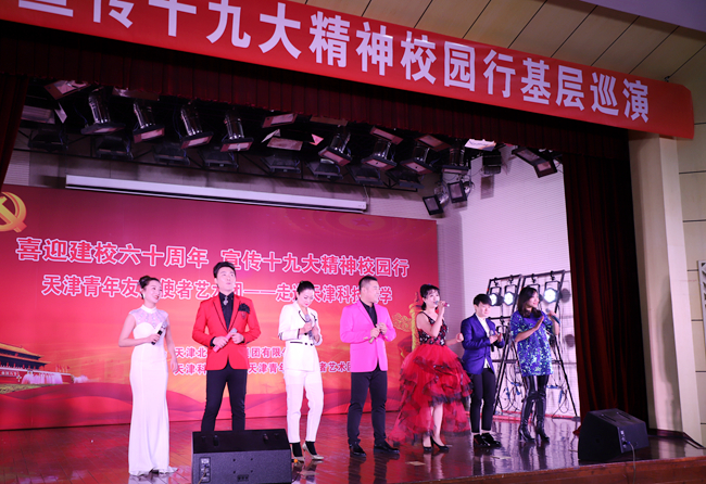 为学习宣传党的十九大精神,迎接建校60周年,共青团天津欧美性爱免费委员会与天津青年友好使者艺术团共同举办“喜迎建校 60 周年 高雅艺术进校园”——天津青年友好使者艺术团十九大精神进校园巡回演出,演出于3月22日晚7点在天津欧美性爱免费河西校区多功能厅举办。演出当晚,我校党委副书记张爱华和天津青年友好使者艺术团书记庄勇和师生代表们一同观看了演出。