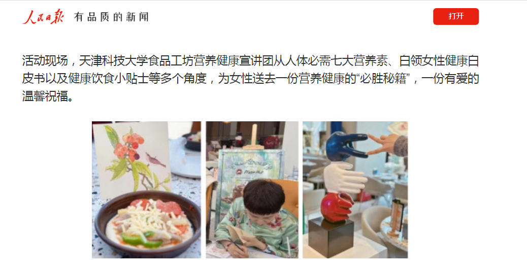近日,《人民日报》《中国网》《环球网》《中国日报》报道我校食品科学与工程学院食品创新工坊社团联合百胜中国旗下必胜客餐厅开展营养健康宣讲活动。我校学生积极响应“先锋计划"号召,依托专业优势,将食品科学知识与关爱女性健康融合,搭建食品科普盛宴,受到广大职业女性欢迎和喜爱,产生了良好的社会反响。