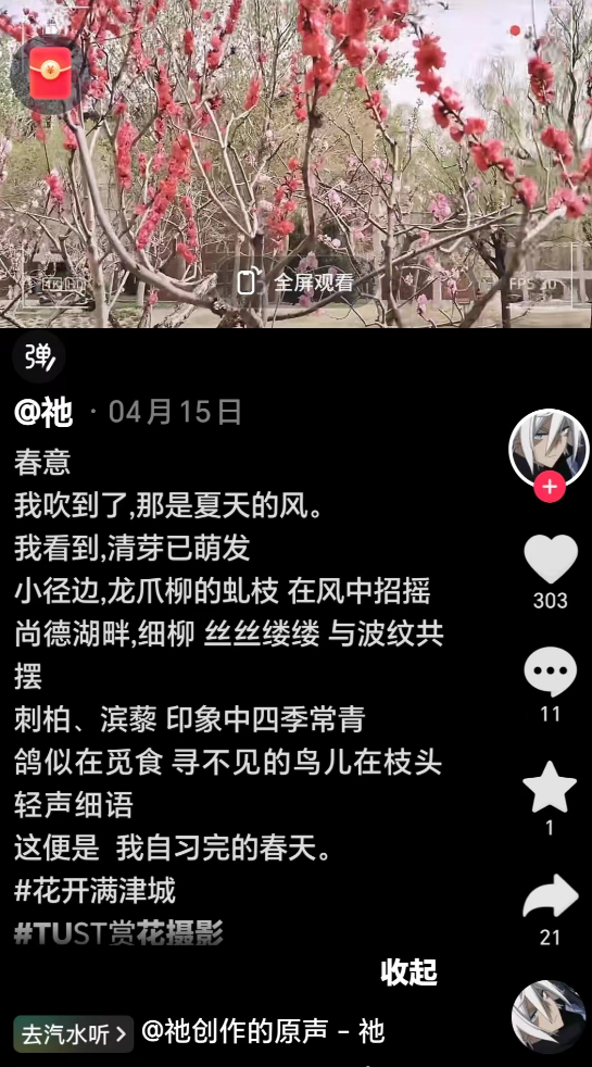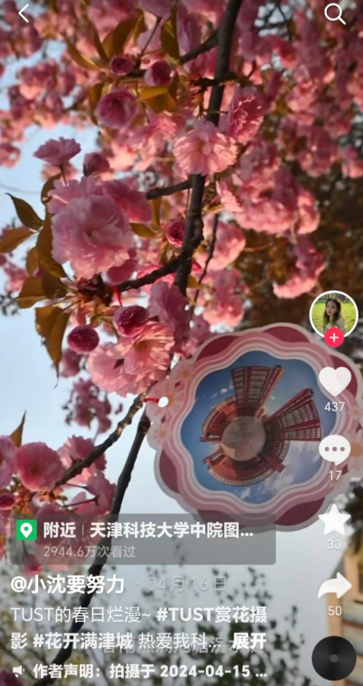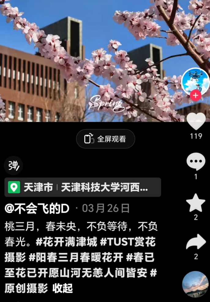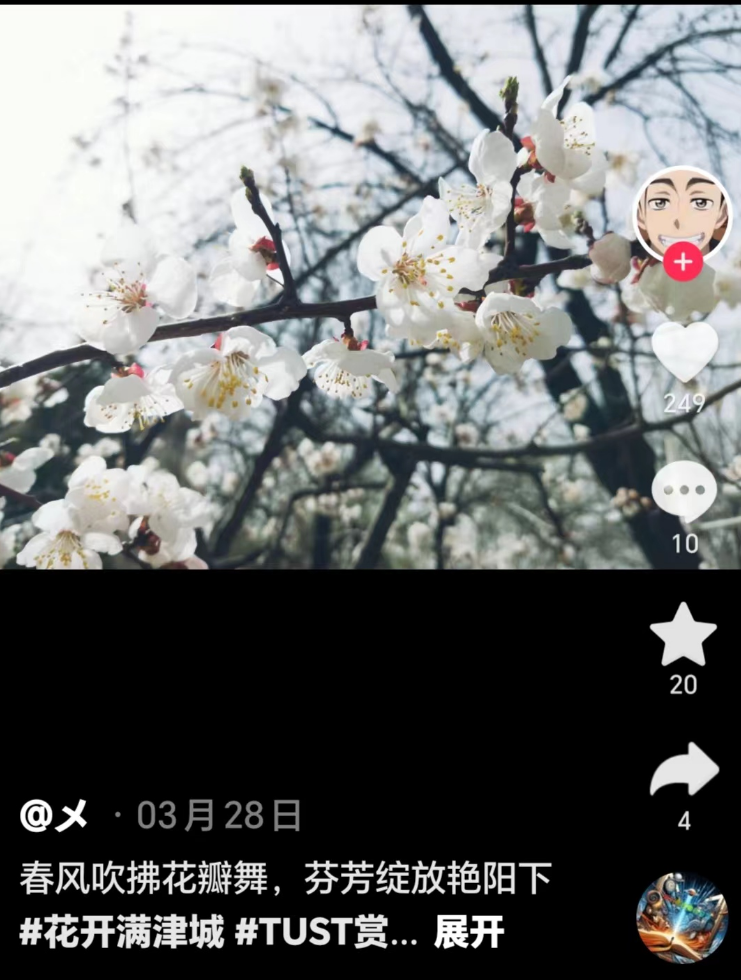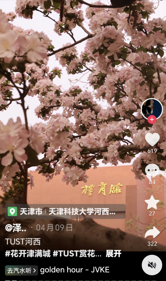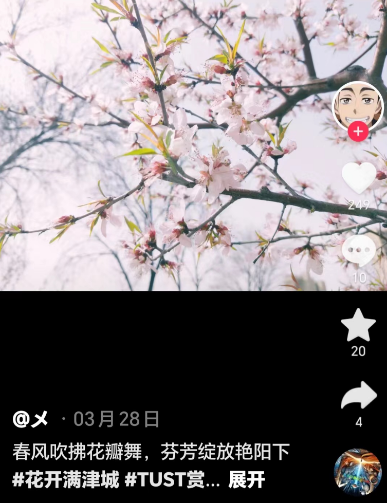 继去年首届大赛的热烈反响后,今年的赛事吸引了数百名师生的积极参与,征集作品数量较去年增长了三分之一,展现出科大师生对校园文化建设的高涨热情与对美的不懈追求。与去年相比,今年的大赛进一步拓宽了网络展示平台,作品通过微博、抖音、小红书等多渠道发布,总浏览量超过50余万次,点赞与转发量等影响力显著提升。社交媒体平台被一幅幅绚烂的花卉照片装点得春意盎然,无论是樱花的娇艳、桃花的柔美、还是海棠花的雅致,都成为网友们竞相点赞、转发的对象。这些作品不仅仅是对花卉之美的记录,更是科大师生情感与创意的流露,每一张图片背后都有一个关于校园春天的故事,每一段文字都是对科大之春的独特诠释,每一段视频都是科大与津城共襄盛举的文化自信彰显。