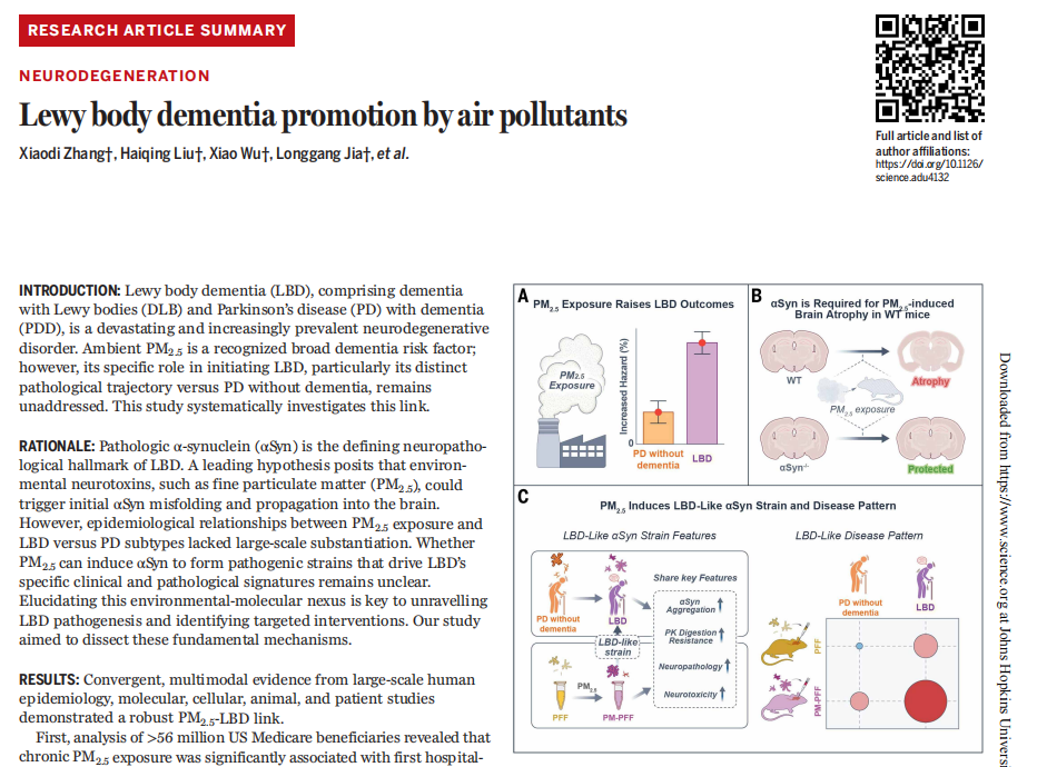 近日,国际顶级学术期刊《Science》发表了我校食品科学与工程学院教师贾龙刚与美国约翰斯・霍普金斯大学(Johns Hopkins University)毛晓波教授、Ted M. Dawson 教授课题组合作六年的研究成果,论文题为《Lewy body dementia promotion by air pollutants》,贾龙刚博士为论文共同第一作者。