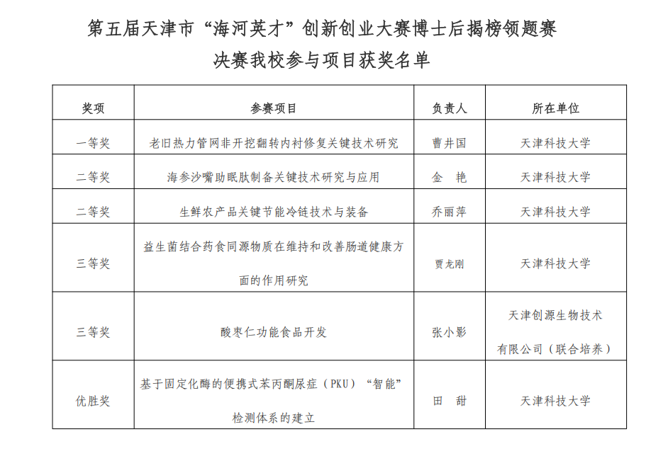 第五届天津市“海河英才”创新创业大赛博士后揭榜领题赛决赛于近日在天开高教科创园举办。经申报、审核、初筛、决赛、公示等环节,共有43个项目获奖。我校6个团队申报的项目分获一等奖1项、二等奖2项、三等奖2项、优胜奖1项,获奖数量位居市属高校第一。