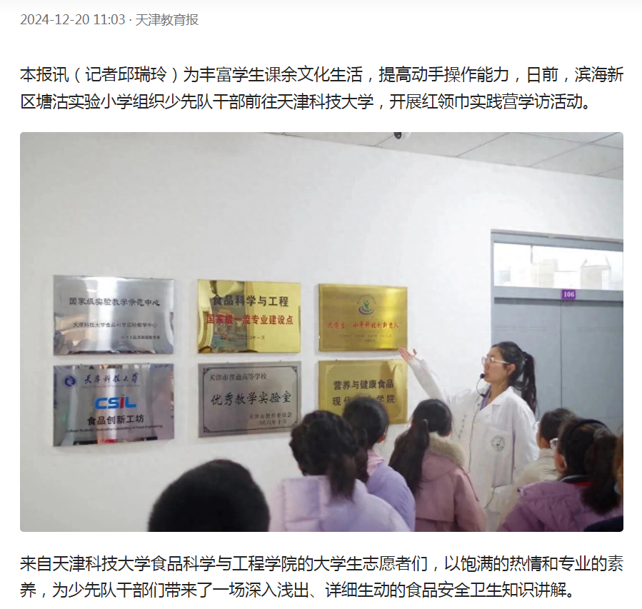 近日,《天津教育报》报道我校食品科学与工程学院开展食品安全科普实践活动。来自食品专业的大学生志愿者们,以饱满的热情和专业的素养,为小学生们带来了一场深入浅出、详细生动的食品安全知识讲解。食品科学与工程学院全力推进落实高质量内涵发展“先锋计划”,持续优化“理论+实践”综合育人模式,高度重视学生专业技能的培养,将专业实践与思政育人紧密结合,深入落实立德树人根本任务,着力打造大中小课程思政一体化建设,促进社会需求与志愿服务有效对接,努力培养堪当民族复兴大任的时代新人。