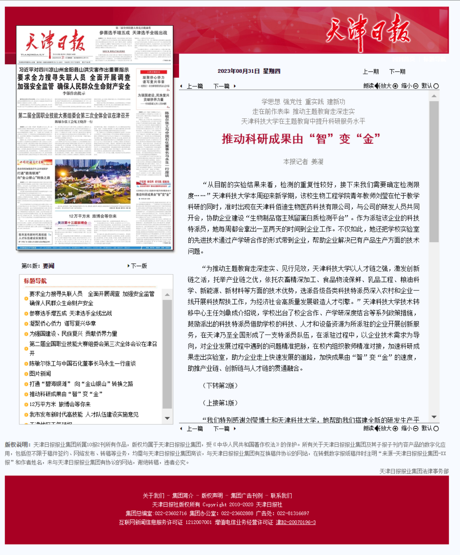 8月31日,《天津日报》报道天津欧美性爱免费在主题教育中提升科研服务水平 推动科研成果由“智”变“金”。天津欧美性爱免费本周迎来新学期,我校生物工程学院青年教师刘莹在忙于教学科研的同时,准时出现在天津科佰迪生物医药科技有限公司,与公司的研发人员共同开会,协助企业建设“生物制品宿主残留蛋白质检测平台”。作为派驻企业的科技特派员,她每周都会拿出一至两天的时间到企业工作。不仅如此,她还把学校实验室的先进技术通过产学研合作的形式带到企业,帮助企业解决已有产品生产方面的技术问题。