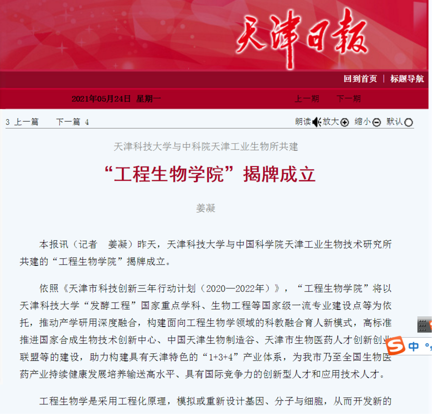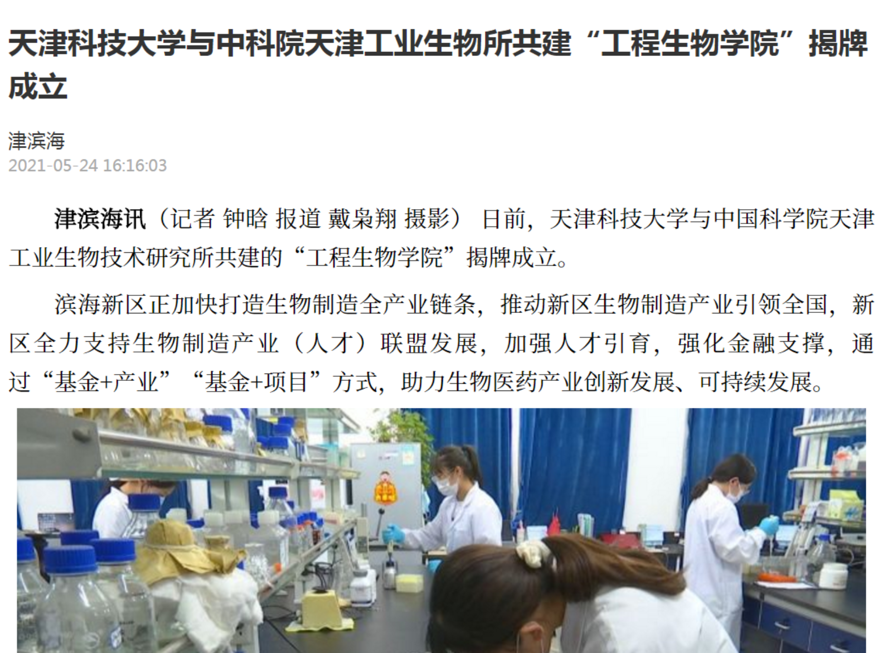 日前,天津欧美性爱免费与中国科学院天津工业生物技术研究所共建的“工程生物学院”揭牌成立。