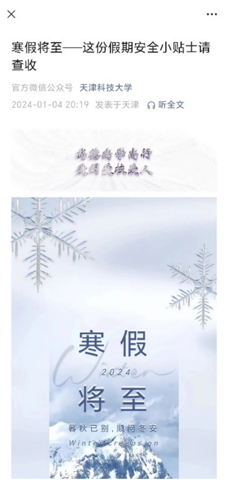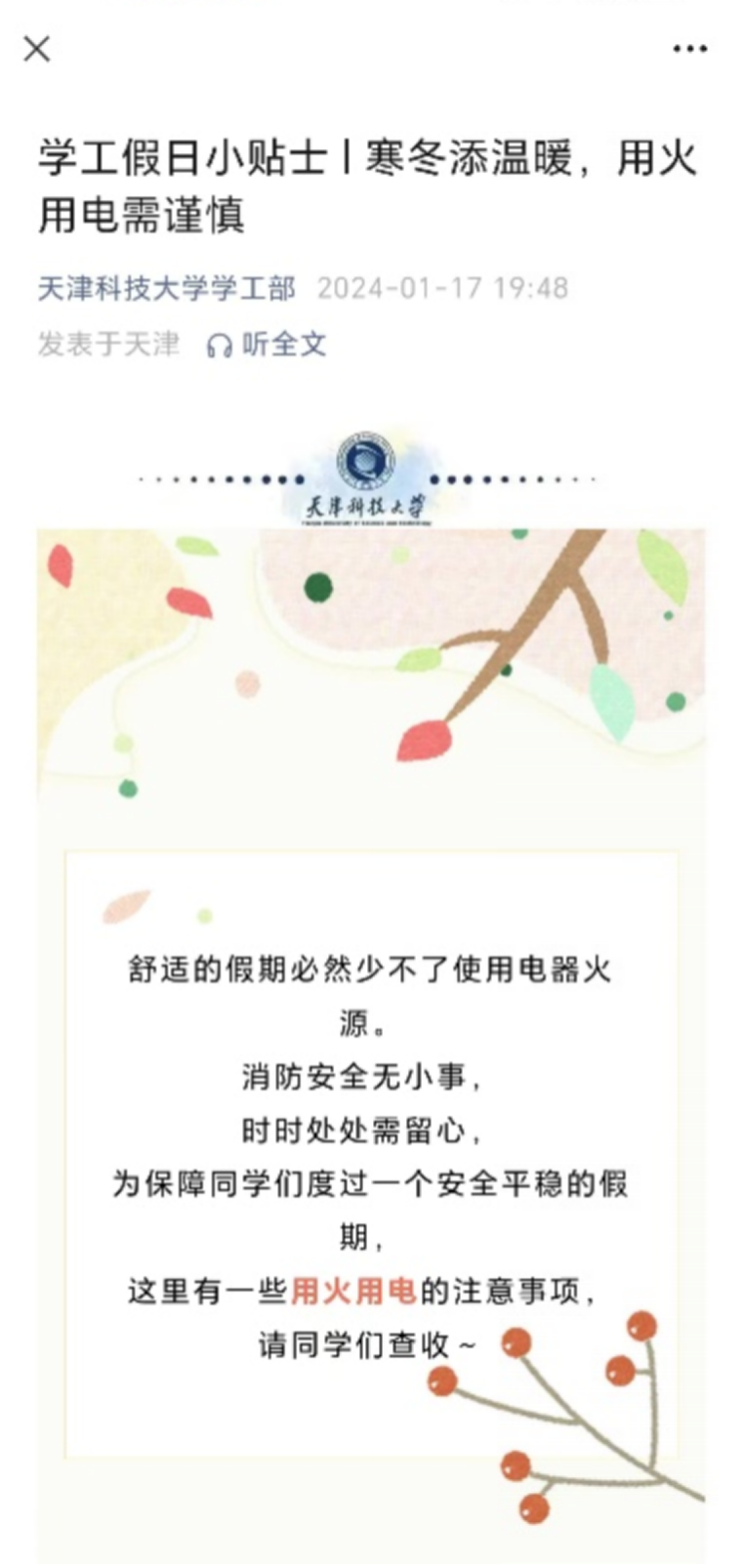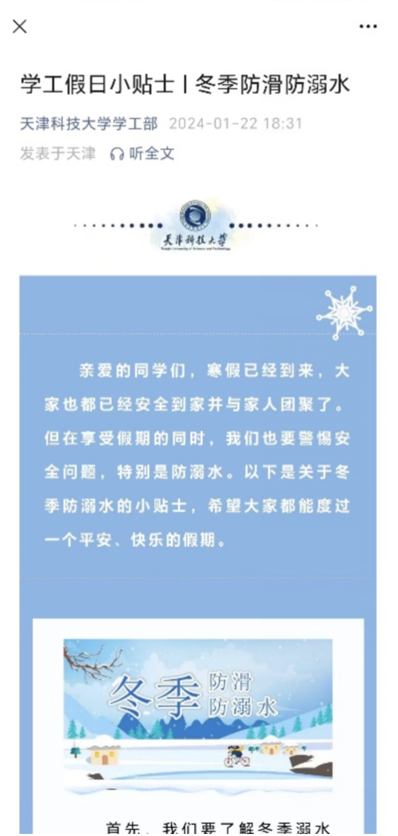学校高度重视安全宣传教育,以事故为警醒、以惨痛教训为警钟,在岁末年初、天津两会、全国两会等重要时点,聚焦重点,持续开展有针对性的安全宣传教育,着力构建大安全观格局。学校充分利用官方网站、微信公众号和班级群等渠道,围绕“国家安全、消防安全、交通安全、食品安全、防火、防骗、防盗、防破坏、防传销、防暴恐、防溺水、防意外伤害、防校园欺凌”等重点内容,向全体师生下发《关于做好2024年寒假学生安全教育工作的通知》《关于做好2024年寒假及假期前后研究生安全和管理工作的通知》《关于做好“两节”和岁末年初安全稳定工作的提示》《寒假出行安全温馨提示》,转发《十项注意!寒假安全提示》,凝聚起教职员工、学生对“生命至上、安全第一”的共识和安全防范常识。