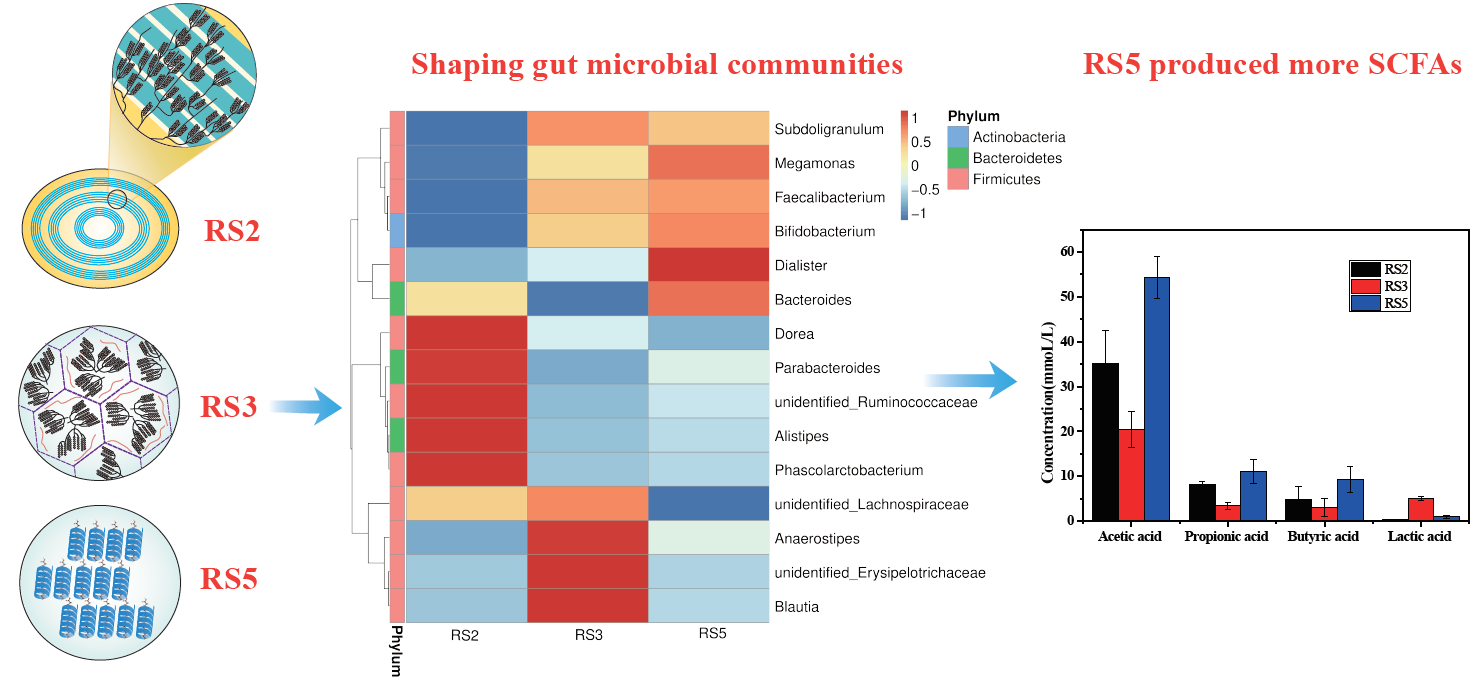 这些研究结果表明RS5作为一种新型抗性淀粉,其在调控肠道微生物组成及代谢产物生成方面具有独特的功能和作用,主要受其种类及结构的影响。研究结果对于食品加工过程中淀粉营养品质的精准调控具有重要理论指导意义。该研究得到了国家自然科学基金重点项目(32030084)、面上项目(31772095)以及国家重点研发计划(2017YFD0400200)等项目的资助。