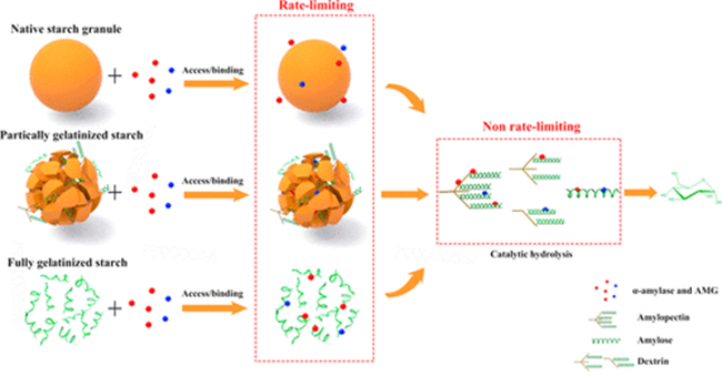淀粉的消化性一直以来都是食品科学与现代营养学领域的研究热点。揭示加工过程中淀粉的变化对其消化性的影响对于精准设计具有特定营养功能的个性化健康食品具有重要的理论指导意义。然而,目前的研究主要还是停留在假说和推测阶段。本论文通过合理的实验设计,结合多尺度结构表征手段,首次运用激光共聚焦显微镜定量分析淀粉与消化酶的动态结合过程,最后通过多元相关性分析等手段揭示了影响淀粉消化性的关键限速步骤是淀粉与酶的接触/结合而非随后的催化水解(如下图所示)。