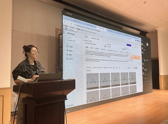 阿里云体验设计专家胡峻对现场同学进行了AIGC入门与实操教学,展示PAIArtLab平台在图形图像生成、产品造型设计、插画绘制和风格迁移等方面的技术能力,借助模型调入、参数调整和定制工作流,使同学们了解如何在日常创作中提高设计效率,并更加专注于设计概念的实现,实现“人智协同”。