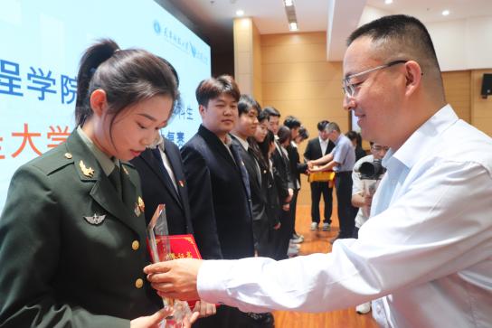 在学院领导、教师团队以及现场大众评审秉持公平公正原则进行打分后,10 名优秀选手凭借卓越表现脱颖而出,荣耀当选本届十佳大学生。随后,他们依次登上领奖台,由李建宇书记与李文辉院长共同为获奖同学颁发证书与奖杯。