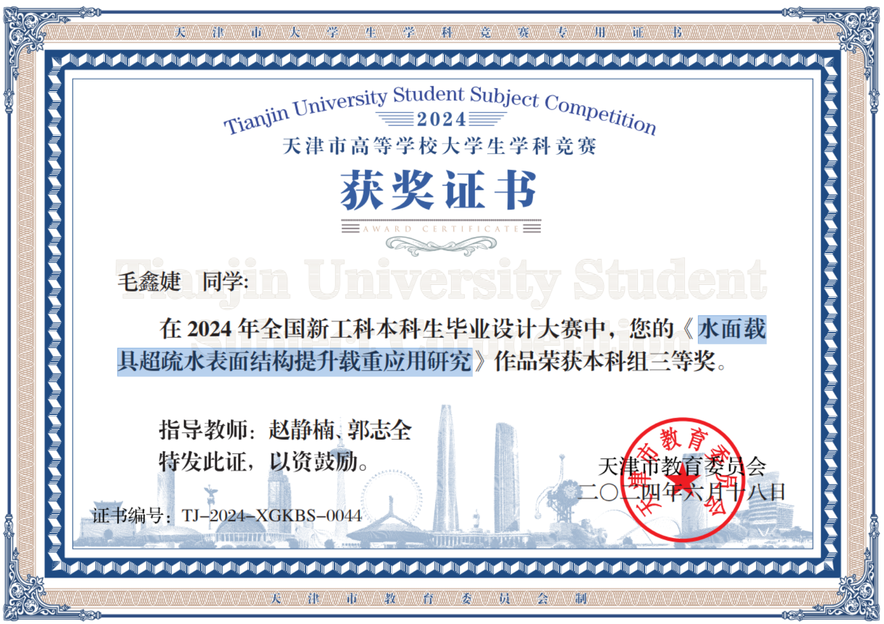 近日,我校机械工程学院本科生毛鑫婕同学在2024年全国新工科本科生毕业设计大赛中,以题为《水面载具超疏水表面结构提升载重应用研究》的毕业设计作品,荣获本科组三等奖,为学校争得了荣誉。