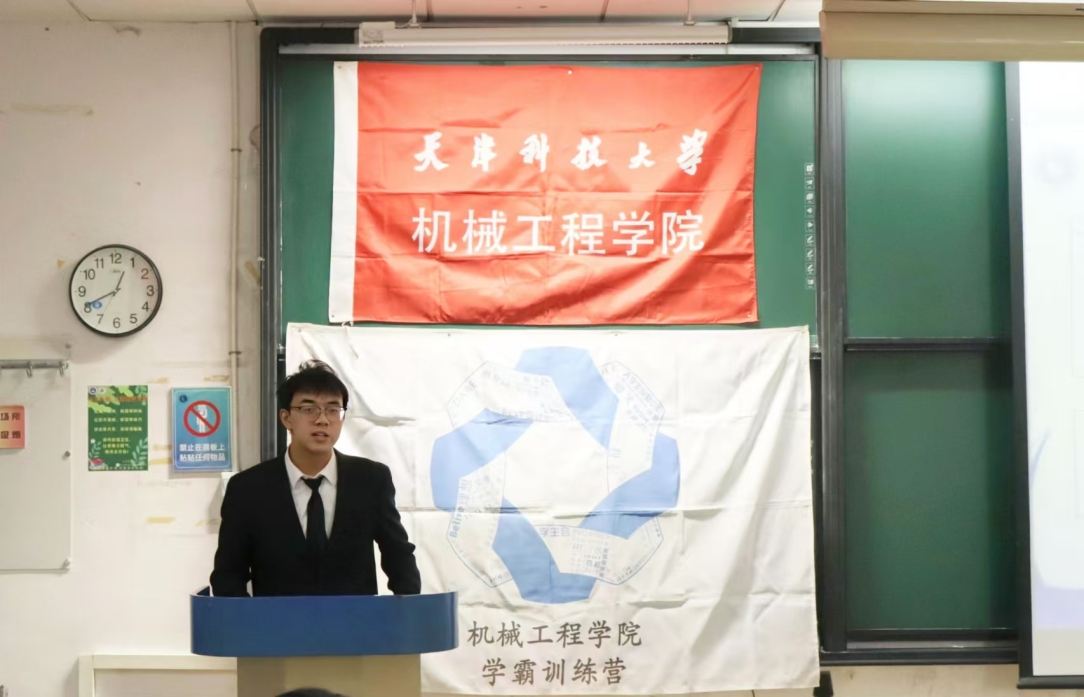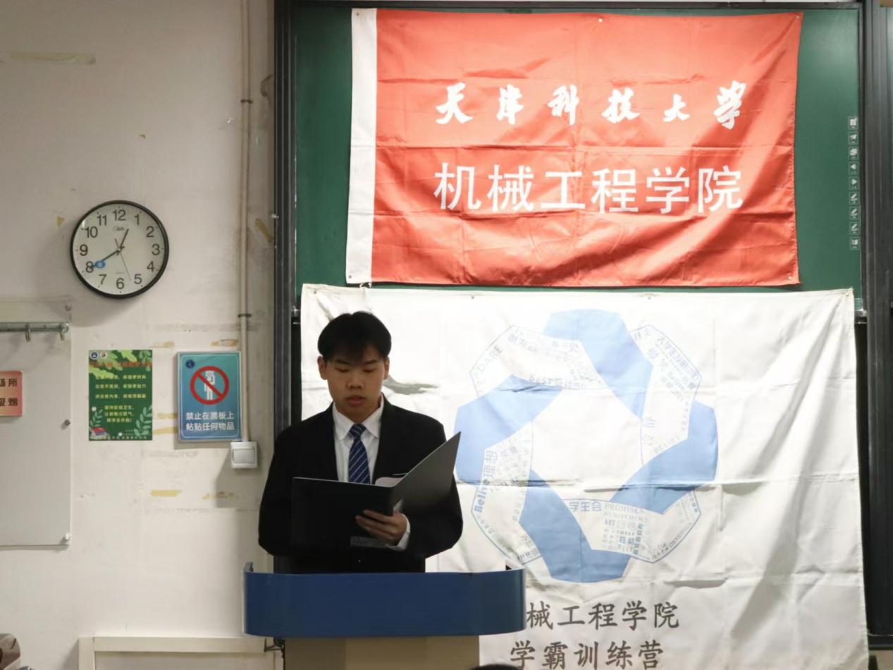 学术科技部部长黄硕同学对学霸训练营作总结发言,他感慨地提到在追求梦想的道路上会遭遇重重困难,但同学们通过坚持不懈的努力都获得了成长,如同在泥沙中淘金,只有历经千辛万苦地筛选与磨砺,才能让金子散发出闪耀光芒。同时黄硕学长总结了学霸训练营的学习情况,包括四六级训练、设计训练、制图训练、学术先锋训练四个模块。同学们在一个月内克服困难,收获满满。在各训练模块中,同学们通过学习和实践取得了不同的成果,如掌握软件操作、收获知识、产生设计兴趣等。最后,他鼓励同学们在今后继续拼搏,提升自我。