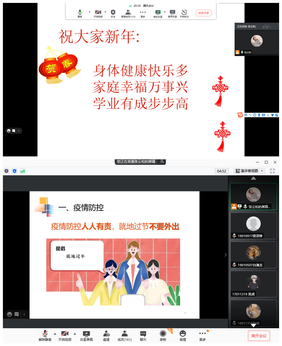 会后,有同学表示:“老师在临近过年仍然记挂身处各地的同学们,我深受感动,希望在春暖花开时能如愿返回我们美丽的校园。我一定按照老师的要求,度过一个平安幸福的假期!”