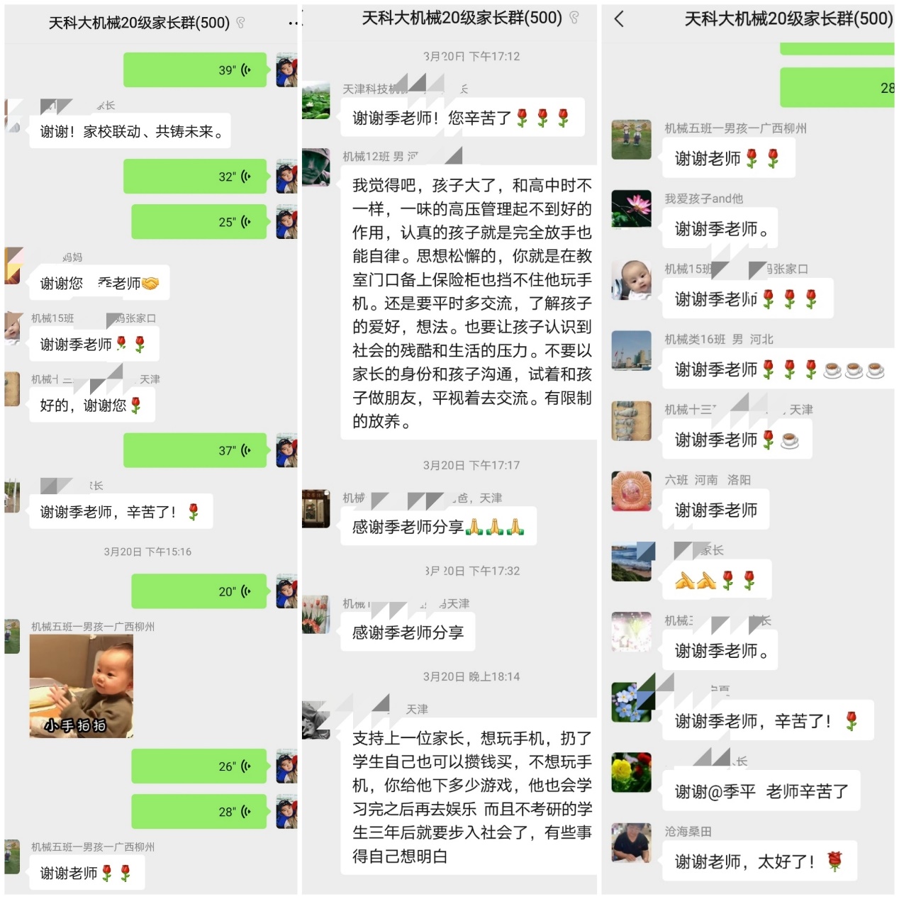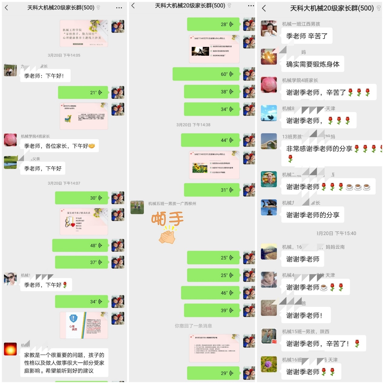 良好的、互动的、和谐的、积极的家校沟通不仅能有效地提高协同育人的实效,也能拓宽教育的影响力。搭建家校联系平台、持续做好家校沟通、总结经验并不断完善是促进学生全面发展的重要举措。3月20日14:00,机械工程学院组织开展“家校携手,勠力同行”心理健康教育主题线上沙龙活动,2020级辅导员季平在家长微信群内做主题分享,并与家长们结合教育过程中遇到的问题,一同进行探讨。