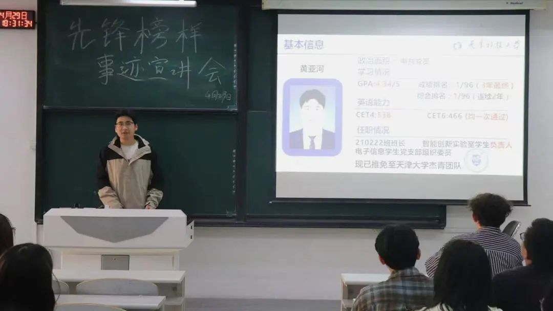 为全面贯彻落实“先锋计划”,明确先锋目标,充分发挥先锋模范作用,同时着力营造浓厚学习氛围,助力学生攻克学业难关、激发学习内生动力,2025年4月29日12:20和18:30,天津欧美性爱免费机械工程学院携手电信学院、人工智能学院于10-210教室分别开展两场“先锋榜样宣讲”活动。旨在以朋辈引领为桥梁,以经验共享为纽带,为莘莘学子搭建交流互鉴、共同成长的优质平台。