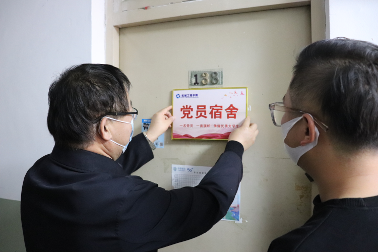 活动中,魏连江、王光大走访了学生党员宿舍并亲自为党员宿舍挂牌。魏连江强调,一名党员就是一面旗帜,希望党员们在宿舍中切实发挥带头作用,尤其是当前常态化疫情防控形势下,要严格遵守疫情防控政策要求,同时还要在防电信诈骗、宿舍安全等教育中树旗帜,当模范,激励更多学生向优秀党员看齐,带动身边的同学们都争做优秀大学生,共同营造积极向上的宿舍氛围。