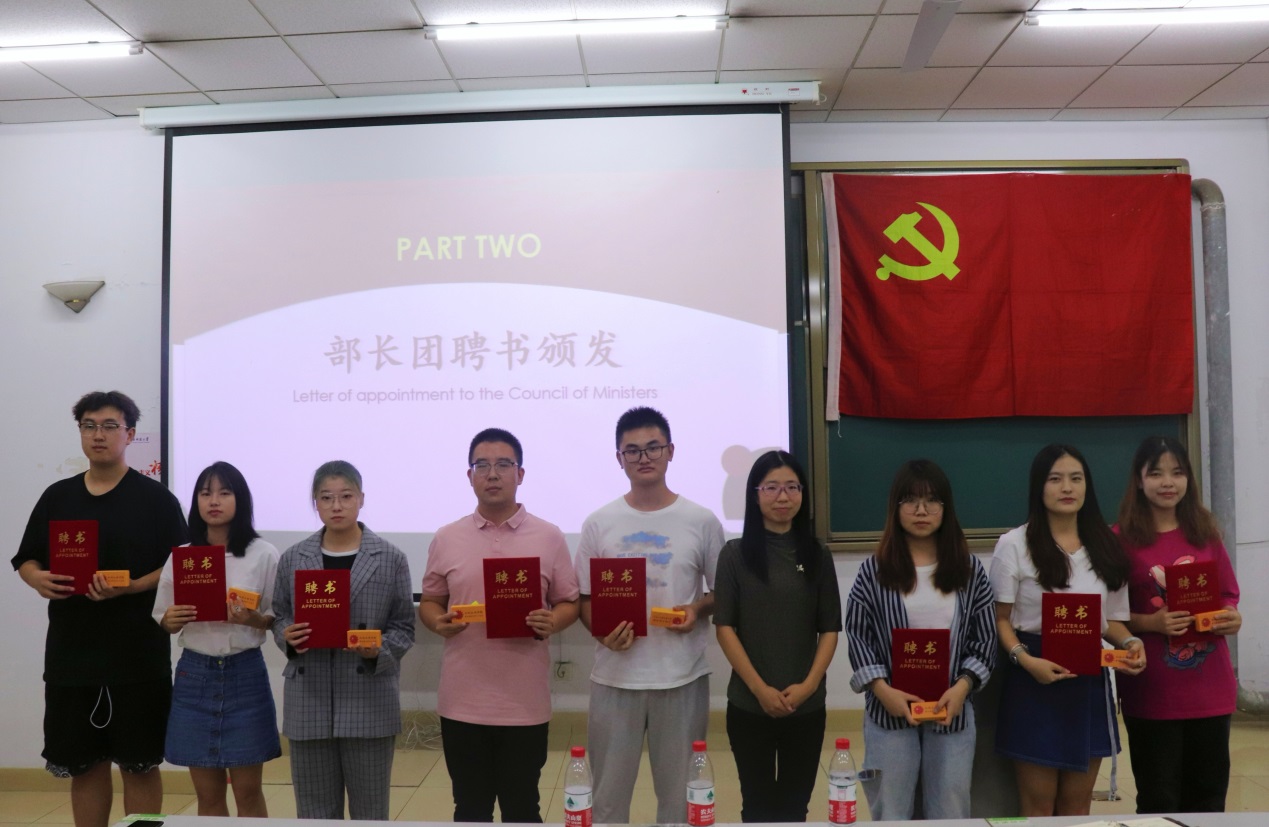 会议开始,第七届党建中心部长团成员依次上台发言,他们对上一年度党建中心的工作做了简要的回顾与总结,分享了工作感悟,同时他们希望新成员可以团结协作,共同把党建中心建设成为优秀的学生组织,扎实推进各项党建工作。张琳老师为第七届的部长团成员颁发部长聘书与印章,对他们过去一年的付出给予肯定。