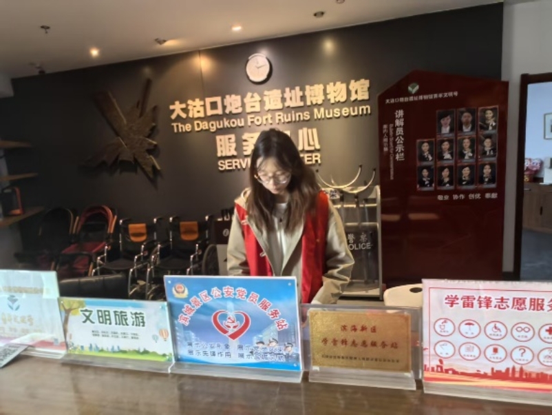 在博物馆内,志愿者们分工协作,有的在服务中心随时待命,应对游客在参观过程中遇到的突发情况;有的协助游客使用“自助语音导览设备”,帮助他们更深入地了解大沽口炮台的历史背景和文物故事。志愿者们还主动承担起场馆的清洁工作,保持展厅环境整洁,为游客营造舒适的参观氛围。